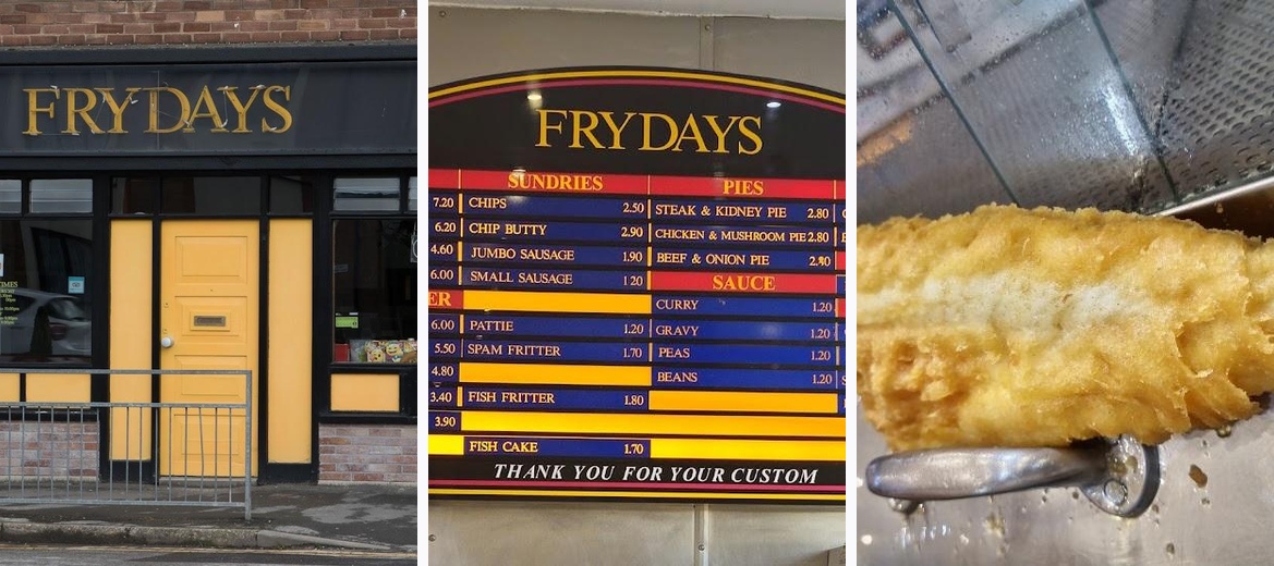 Frydays specializes in fish and chips, offering large, medium, and small portions of haddock, alongside a range of sundries like chips and chip butties. Pies and drinks are also available.